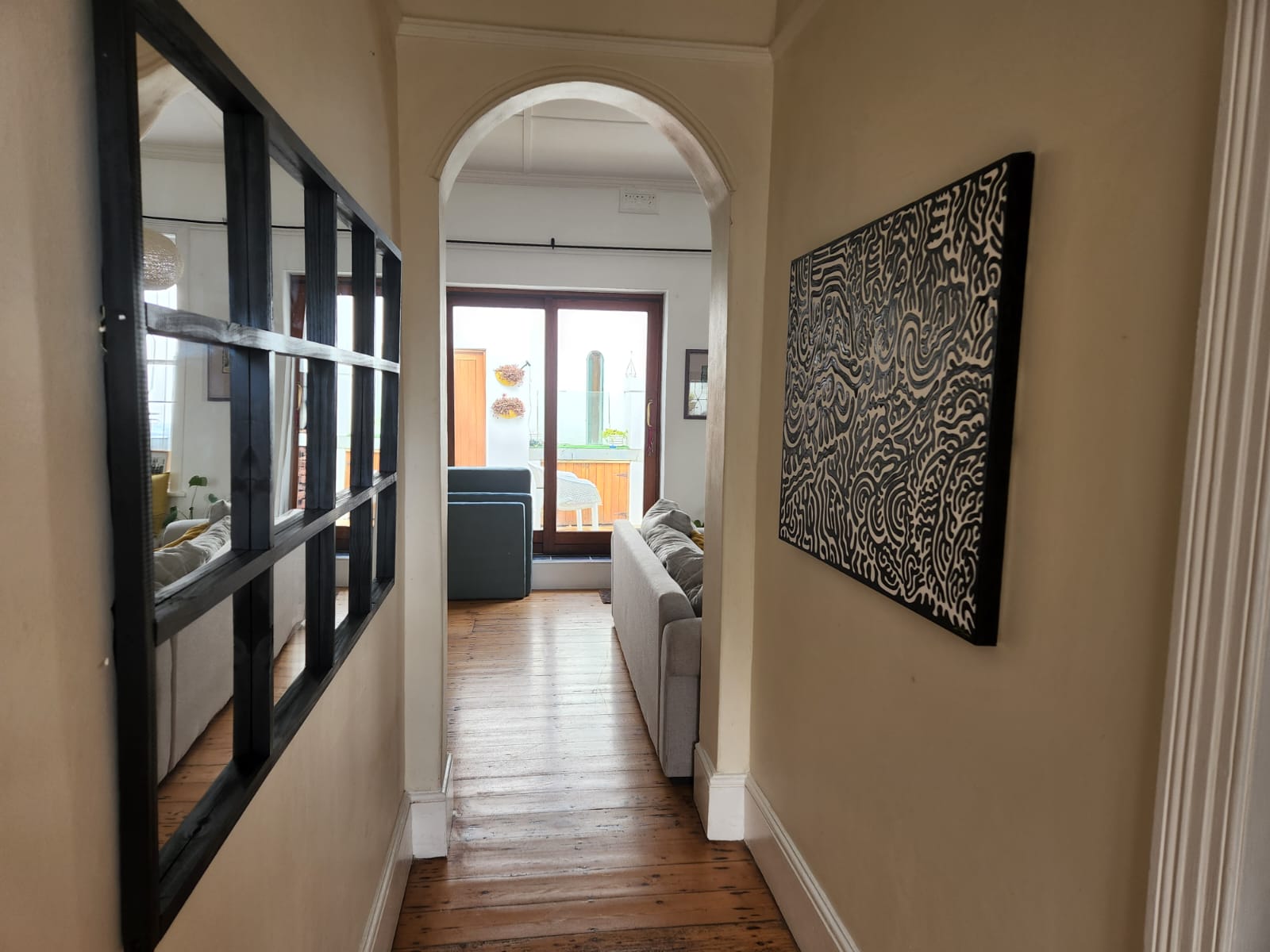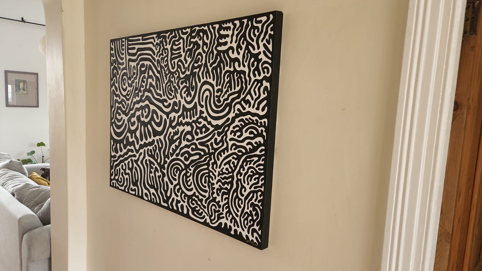 The title “Progeny” suggests a focus on growth and evolution, inviting viewers to ponder the impact of past generations on the present and future. Kara Fox’s signature style is evident in the meticulous detail and rhythmic flow of the artwork. There is a very distinct black outline to the interior shape, using a variance in texture for the line which is matt acrylic, while the outer background is painted using acrylic with a gloss finish. The interior shape was crafted using a matt acrylic to bring texture to the canvas.